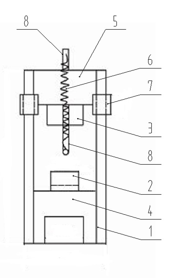 圖中:1-立體架,2-凹模,3-凸模,4-凹模座,5-凸模座,6-彈簧,7-滑動套,8-連桿。