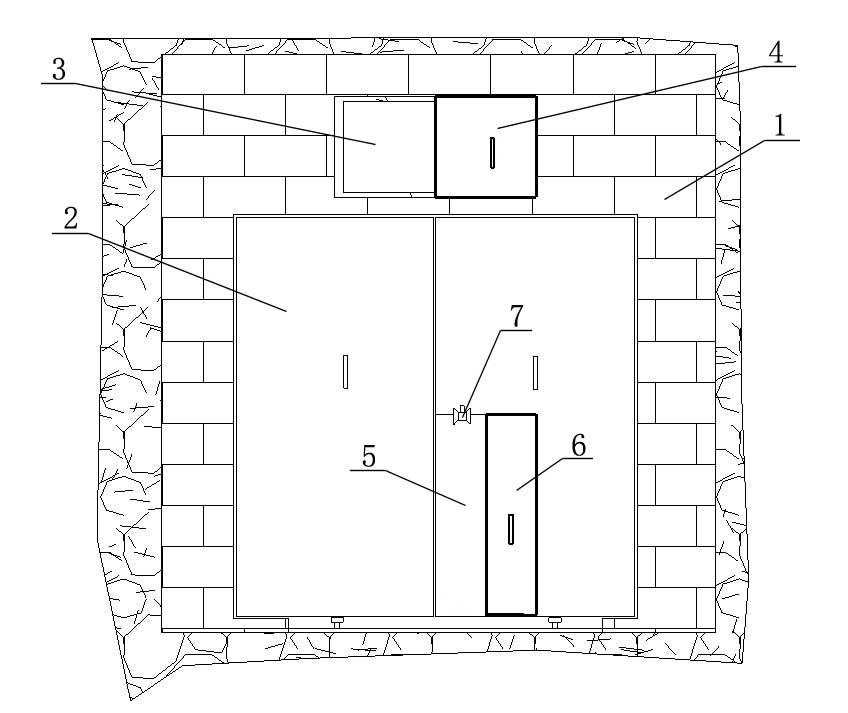 圖中:1-墻體、2-風門、3-調風窗、4-第一窗門、5-運料窗、6-第二窗門、7-定滑輪。
