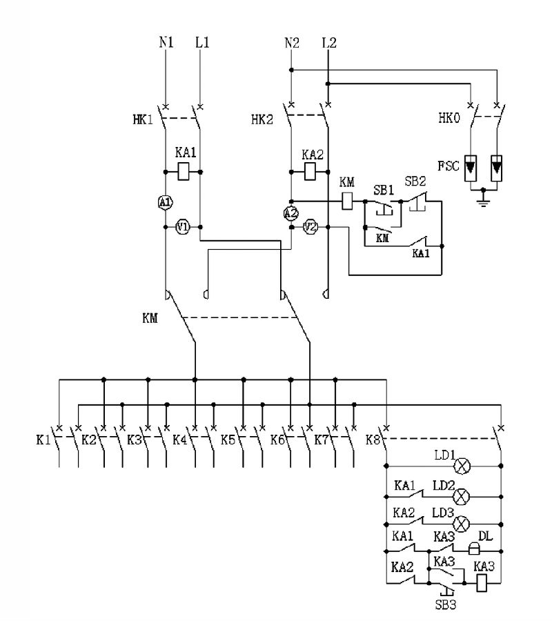 具體實施時,還包括第一-第八開關K1-K8、電源指示燈LD1、UPS電源失壓指示燈LD2、備用電源失壓指示燈LD3、電鈴DL、第三繼電器KA3、常開報警解除按鈕SB3;其中,第一-第八開關K1-K8均并接于主控接觸器KM的兩組主觸點的動觸點之間;電源指示燈LD1并接于主控接觸器KM的兩組主觸點的動觸點之間;UPS電源失壓指示燈LD2、第一繼電器KA1的常閉觸點依次串接構成串聯支路,且該串聯支路并接于主控接觸器KM的兩組主觸點的動觸點之間;備用電源失壓指示燈LD3、第二繼電器KA2的常閉觸點依次串接構成串聯支路,且該串聯支路并接于主控接觸器KM的兩組主觸點的動觸點之間;電鈴DL、第三繼電器KA3的常閉觸點、第一繼電器KA1的常閉觸點依次串接構成串聯支路,且該串聯支路并接于主控接觸器KM的兩組主觸點的動觸點之間;第三繼電器KA3的線圈、常開報警解除按鈕SB3、第二繼電器KA2的常閉觸點依次串接構成串聯支路,且該串聯支路并接于主控接觸器KM的兩組主觸點的動觸點之間;第三繼電器KA3的線圈、第三繼電器KA3的常開觸點、第一繼電器KA1的常閉觸點依次串接構成串聯支路,且該串聯支路并接于主控接觸器KM的兩組主觸點的動觸點之間。工作時,通過第一-第八開關能夠將8路負載(即DCS)并接于主控接觸器的兩組主觸點的動觸點之間。電源指示燈實時指示負載是否供電。UPS電源失壓指示燈實時指示UPS電源是否失壓。備用電源失壓指示燈實時指示備用電源是否失壓。當UPS電源或備用電源發生失壓時,電鈴實時發出聲音報警。第三繼電器實時控制電鈴。按下常開報警解除按鈕,即可解除報警。