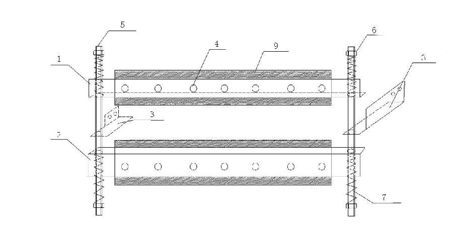 圖中,1-上清煤器框架,2-下清煤器框架,3-固定架,4-清掃皮帶固定孔,5-連接螺栓,6-螺母,7-彈簧,8-固定板,9-清掃皮帶。