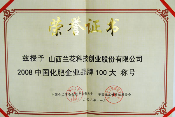2008年11,中國化工學(xué)會(huì)化肥專業(yè)委員會(huì)和中國化工情報(bào)信息協(xié)會(huì)授予公司2008年中國化肥企業(yè)品牌100大稱號(hào)