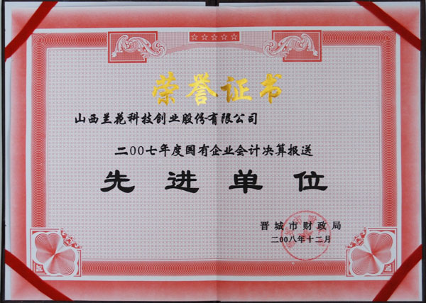 2008年12月,晉城市財政局授予公司2007年度國有企業會計決算報送先進單位