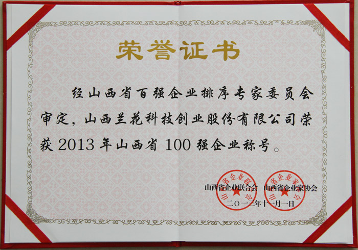 2013年11月,公司榮獲2013年度山西省100強企業稱號