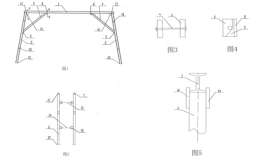 圖中:1-棚梁 2-棚腿 3-斜撐 4-連接件 5-卡欄 6-夾板 7-螺栓 8-直槽 9-V型槽 10-護板 11-護桿 12-底座 13-拉桿 14-拉桿套筒