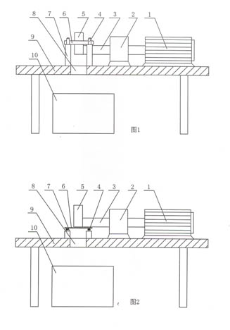 圖中:1-電動機;2-減速器;3-動力輸出軸;4-卡柱;5-柱狀壓制模具;6-待加工件;7-支架;8-成品出口;9-機座;10-成品暫放箱。