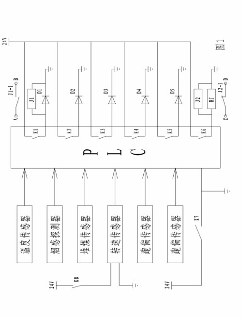 使用時,狀況采樣單元中:溫度傳感器用以監測帶式輸送機主滾筒(即主動滾筒)軸承處的溫度;煙感探測器用以監測帶式輸送機主滾筒上方的煙霧狀況;溫度傳感器和煙霧傳感器的設置目的是為了對帶式輸送機實現火災監測;堆煤傳感器用以監測帶式輸送機是否發生堆煤狀況;轉速傳感器用以監測帶式輸送機的皮帶是否發生打滑狀況;跑偏傳感器用以判斷帶式輸送機皮帶是否跑偏;當上述傳感器監測到狀況發生時,即會向PLC控制器輸出相應信號,由PLC控制器控制相應的常開接點閉合,進而驅動狀況顯示單元中相應的狀況指示燈發光,用以指示出帶式輸送機發生何種故障;同時,PLC控制器閉合串聯于繼電器J2的供電回路中的常開接點,繼電器J2和聲光報警器得電,聲光報警器報警,繼電器J2的串聯于帶式輸送機開關控制回路中的常閉觸點J2-1斷開,帶式輸送機開關控制回路斷路,帶式輸送機停止運行;其中,在溫度狀況指示燈D1發光的同時,與溫度狀況指示燈D1并聯的繼電器J1也同時得電,其串聯于帶式輸送機自動灑水裝置電磁閥控制回路中的常開觸點J1-1閉合,控制自動灑水裝置的電磁閥動作,由自動灑水裝置對超溫點(即主滾筒)進行降溫防止火災發生。所述溫度傳感器、煙感探測器、堆煤傳感器、轉速傳感器、以及跑偏傳感器皆是現有產品,可由市面購得。